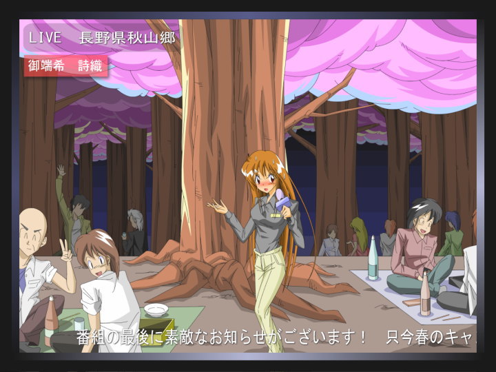 ローアングルから入る映像は見事詩織の下半身を避け、後ろの満開の桜が全国放送で流れた。