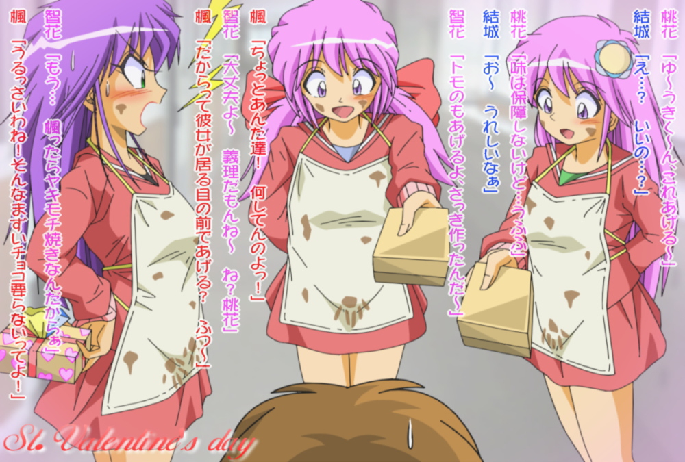 コンセプトは「おしっこを我慢しながらチョコを作った」ですネ。3人とも自分のアソコのチョコに気付かず結城にチョコをプレゼントするのでした。 |