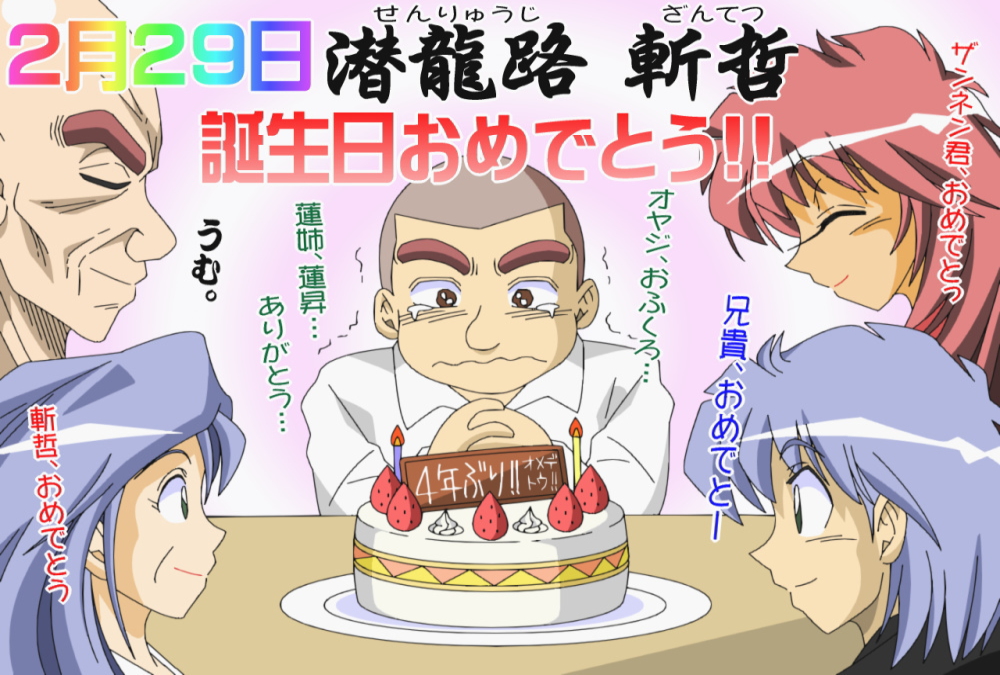 と言っても誰かを祝うわけでもなくキャストラージュキャラの誕生記念絵になります。4年前の2月29日はまだキャストラージュは誕生しておりませんのでいわば斬哲君とキャストラージュ誕生の記念絵になるのかな^^b ニンニク食って頑張ろう! 次は2020年ですよ!(笑 |