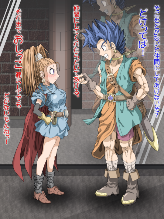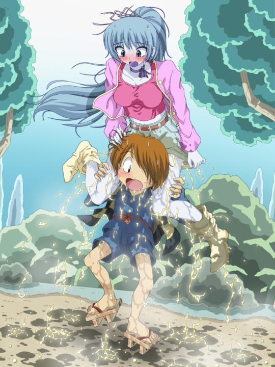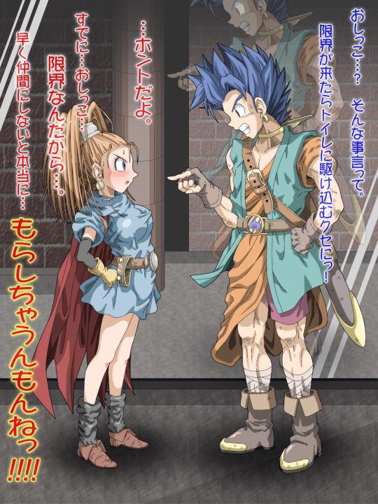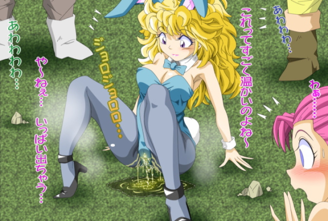 | 投稿者:スローグさん 掲示板ナンバー[93] ミネア 「ちょ…ちょっと!? マーニャ、見張りしてなさいよ!」 マーニャ 「ごめん…だって…音聞いてたら…したくなっちゃったんだもん 漏れそうだったからつい…」 ジャンケンで決め見張り役だったマーニャはミネアの放尿音で限界に。隣で怒るミネアだがそのまま二人仲良く放尿タイムに入る。 |