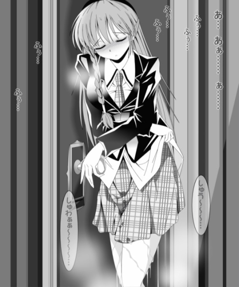 授業中に尿意を催して放課後にトイレに寄ろうとしたが、人か多いので断念して下校していたが、外は寒いうえスカートは短いので尿意はドンドン加速していき前を押さえて急いでトイレを探し初めて、諦めて物陰にしようとしたら直前にトイレが見つかりそのままトイレに入り放尿 |
