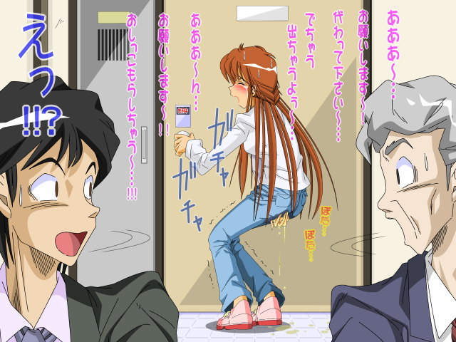 | 不運にも女子トイレは長蛇の列。このままじゃもらすと意を決して男子トイレに駆け込む朋美だが朋美が使える「便器」は使用中!そして徐々にシミを広げていく…。 |