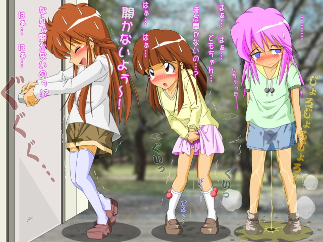 | 公園で遊ぶ朋美、麻衣、百合。悪ふざけで「おしっこ我慢大会」を決行!そろそろ本気で我慢の限界になった3人は急いで公衆トイレにダッシュするもなんとドアは開かない!この先我慢できるわけも無く数分で徐々に決壊していく3人の小学校夏休みの思い出。 |