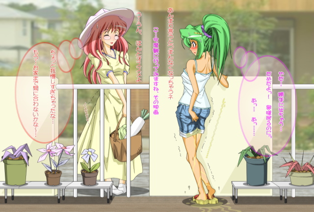 | ある夏の昼下がり絵里ママと佑香のおしゃべりに花が咲く。小粒家と下級生家は割りと家が近く、百合と同年代の子というのもあって佑香と絵里ママはよくお話をするのだ。だが佑香はトイレが恥ずかしくて言えず、夢中になった絵里ママも便意に気付く…。 |
