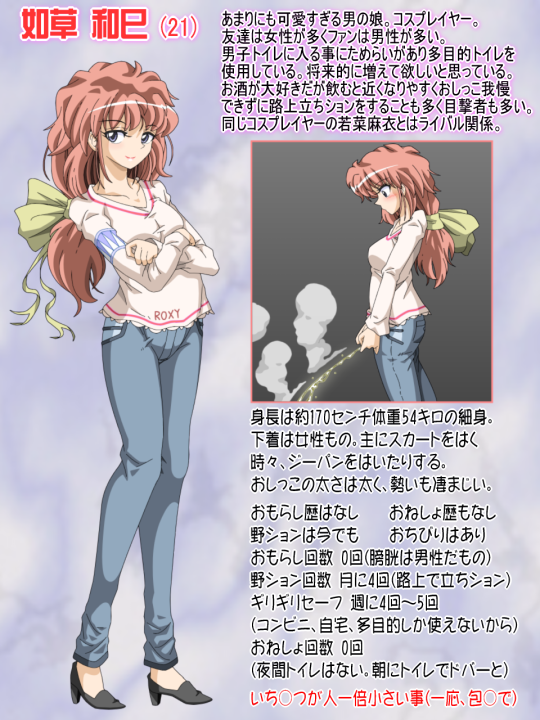 | 顔の特徴 キツネ目 髪型 ロン毛(和巳より長く) 髪の色 紺色 胸 まな板(一応、男なので) 茶藤事務所所属の美形女装家タレント。女装は小1から目覚めていた。回りは性転換も勧めたが両親はありのままに育って欲しいと思い手術は断固拒否した。昔からトイレがなぜか知らずに近いのだが3時間は我慢できる。それ故におしっこの勢いが強くそれをからかわれた事はある。我慢出来なかったら隠れて抵抗もなく立ちション出来る。 おもらし/授業後に男子生徒に邪魔され おちびり歴/意外とない(常にギリギリセーフの状態) 野ション/物陰で何回か おねしょ/意外とない |