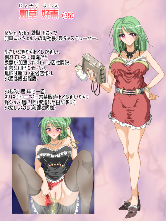 | 逸子と一緒のキャバクラで働いている。ナンバーツーキャバ嬢。噴水や如雨露、おしっこの音を聞くと尿意が加速しやすい。元々トイレが近い。 おもらし歴/大人になって10回くらい おちびり歴/頻繁に 野ション大人になって20回くらい おねしょ/意外とない |