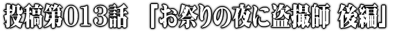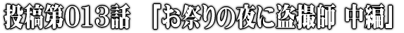 | 盗撮師Aと盗撮師Bは茂みに隠れていた。今日はお祭りの日。 特にお祭りでは野ションの宝庫。今日は盗撮師二人が解説致す。 一組目 やって来たのは如草和巳と揺河響香。和巳は男子だが見た目は女。響香はボーイッシュ美人。これはラッキー 和巳「うーおしっこ漏れるよーマネージャー、見張り頼むね」 響香「もー和巳くんったら。チューハイの飲み過ぎ」 和巳は今日は浴衣姿。パンツをずらし放尿を始める シュイイイイ〜〜〜〜 盗撮師A「うっ浴衣で隠れて何も見えない」 ※見んでもよろしい。後で後悔するだけやでー。 盗撮師B「勢いはいいねー。言ってたけどチューハイ飲み過ぎたみたい。量も半端ない。」 そして響香の番。ジーンズを下ろして大放尿が開始〜 ぷしゅううぅぅ〜〜 盗撮師A「すんげーびっくりするぐらい大音量やな」 盗撮師B「こりゃあ。大物だ。今日一番だな。」 二組目 今度は村下涼子と如草正美。二人はあの時の事件以来から関わりを多く持った。 そして二人とも尿意の限界だった。 涼子「悪い雅紀(正美の本名)!私が先にションベンさせてもらうよ。」 正美「はいはい。モラシタさん。漏らさないでね。(私もかなり限界だが)」 涼子「うるさい。その名前で呼ぶなっつーの」 シャアアア〜〜〜〜 盗撮師A「なかなか可愛いねーちゃんだな。いいね、いいね。」 盗撮師B「しかもションベンって言い方。なかなかエクスタシー」 そして正美の番である。正美はロングスカートをまくりあげ女性用トランクスをずらし放尿を開始 ジョロロロロ〜〜〜〜 盗撮師A「ガーン。ニューハーフじゃねーかよ。まさかの長身美女が〜」 盗撮師B「いいじゃない。顔が可愛いし。あのギャップがたまんねぇ」 盗撮師A「おい、まじで言ってるの?正気ですか?」 次のターゲット 次にやって来たのは智羽春桜。男装であり二人はがっかししてた。 盗撮師A「ちっ。野郎かよ。見たくもない。がっかりだぜ。ニューハーフに続いて」 諦めた瞬間に春桜はジーンズをずらし放尿を始める プッシャーーーー 春桜「ふぅ。やっぱり多目的トイレは混雑してるな」 盗撮師A「男装女子だー。あーありがたやありがたや」 盗撮師B「これはなかなかの変わり種だなー。」 盗撮師の夜は中編へ続く! そして4組目 今度はバンド「ポテトチップ」のメンバー。三人とも既に尿意が限界だった。 愛子「佑香、見張っててね。もう漏れる。ジュース飲み過ぎた〜」 メグミ「私も限界。佑香、頼むね。あぁおしっこ漏れる」 佑香「うん、わかった。早く済ませてね。見張っておくから」 愛子とメグミのお○んこからおしっこが放水される。 シャアアア〜〜〜〜 愛子「あ〜〜〜〜。スッキリ。漏らすかと思った。気持ちいい。」 メグミ「いやーん。愛子のも凄いけど私も人の事言えないわ。」 そして二人が放尿を終えると佑香も茂みにむかったのだ。 佑香「ごめん。私も限界だったの。あぁ。出ちゃう出ちゃう。」 佑香も尿意の限界だった。パンツをずらししゃがむと同時に ぷしゅううぅぅ〜〜〜〜 佑香「はぁ〜〜〜〜」 愛子「えっ!佑香。私たちより凄い勢いじゃない。凄く大きいよー。」 メグミ「佑香も我慢してたの。」 佑香「うん。実は限界でして。」 盗撮師A「JK三人組かぁ。やっぱり若いしおしっこがの鮮度が違う 盗撮師B「特に緑の髪の子はしゃがんだ瞬間に大放水したね。」 次のターゲット なんとキャストラTVの明智光子さん。まさかの展開だった 光子「うっ。私としたことが。飲み過ぎて野ションなんて・・・・」 スカートをまくりあげパンツを下げてすぐに放尿が始まった。 シュイイイイ〜〜〜〜 盗撮師A「熟女だな。なかなかのおしっこをしている。」 盗撮師B「クールな振る舞いだけどおしっこは凄い量だな」 光子「はぁー。こんなところ見られたら、死んでしまいそう。」 そして次のターゲット なんと有名女子アナの加納綾子。カノパンだった。これは大スクープです。 カノパン「飲み過ぎた。今でも漏れそう。並んだら絶対ヤバイ。」 カノパンは意を決して。パンツをずらしおしっこを始めた。 ぷしゅううぅぅ〜〜 カノパン「いや。音が大きすぎ。こんなところスクープされたら大問題だよ」 盗撮師A「まじかよ。カノパンだよ。最高のおかずだぜ。素晴らし〜〜」 盗撮師B「カノパンのおしっこ。あかん。俺のアンテナが爆発しそうだよ」 そして、その後も先程のターゲットが放尿しに行きます。そして新たな刺客も。後編へ続く(キートン山田風に) 盗撮師B「いやー最高の夜だぜ。あのカノパンだぜ。あんなレアな事は10年間に一度もないよ」 カノパンの野ションを撮影出来たことで二人は余韻に浸っている。 そして次のターゲット サーファーガールの笹原ティナがやってきた。彼女はトイレに並んだが限界になり列を抜け出し茂みに飛び込んできた。 「ヤバイ。漏れちゃう」 彼女がズボンをずらした瞬間に ジュー 「いやー。チビった」 ズボンをずらした瞬間に ぷしゅううぅぅ〜〜〜〜 「は〜〜〜〜」 盗撮