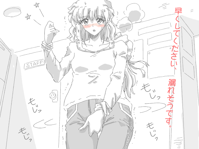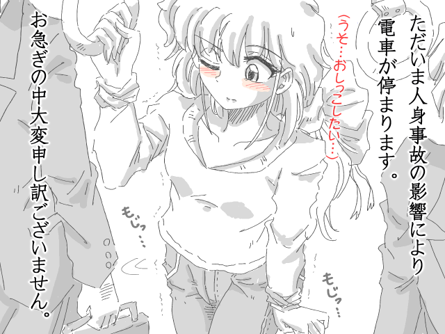 | 今日はなびきと和巳でたらふくお酒を飲んで家に帰る途中であった。居酒屋でなびきは6杯、和巳は10杯飲み放題を堪能していた。 なびき「かなり飲んじゃた」 和巳「うん、飲み過ぎちゃった」 そうお酒を飲み過ぎると例のあれが襲ってくるのだ。そう!尿意である。二人の膀胱に襲ってくるのだ。 なびき「和巳、私おしっこしたい」 和巳「実は僕も我慢してた」 なびき「和巳、私よりのんでたもん」 和巳「あはは・・・」 歩いていると公衆トイレを見つけた。しかし、多目的トイレがなかったのでなびきは提案した なびき「和巳、男子トイレ行ったらびっくりされるから女子トイレに行っても大丈夫やし連れションしよ」 和巳「うん、ありがとう。そうするね」 そして、なびきと和巳は和式便所の個室の隣同士で放尿を始める。先に放尿したのはなびきだった ぷっしゅうううう〜 なびき「はあー気持ちいい」 それに続いて和巳も小さいイ○モツがからレーザービームを発射される シャアアアアア〜 和巳「やば、勢いすごすぎ」 なびき「和巳、音大きすぎ」 モザイク無し 01 モザイク有り 02 トイレが終わると二人は駅に向かって歩いた。そして駅に着き二人は別のホームであり別れたのだ なびき「和巳、またね。」 和巳「うん。今日はありがとう」 そして二人は別のホームに行って解散したのであった。電車が来て再び和巳に例のものが再度、襲ってくるのだ。 和巳「うっまたおしっこしたい」 居酒屋でビール4杯、チューハイ3杯、カクテル3杯飲んで更に和巳は酒が入るとトイレが近くなるのだ。 和巳「まあ、少しだし近くのコンビニによればいいし大丈夫」 と思ってしまったら ガタン! 電車が停まってしまったのだ。 アナウンス「ただいま人身事故の影響により電車が停まります。お急ぎの中大変申し訳ございません」 和巳「うそ」 ![]() 正直、和巳は想定外の事がおきて焦り始めたのだ。30分経っても動かない 和巳「おしっこしたい」 尿意は加速していくのだ。飲んだ影響でトイレが近くなってしまう。そして1時間が経ちようやく電車が動いた。和巳の頭にはおしっこしかない。そして目的地に着いたのだ 和巳「おしっこ、おしっこ」 駅を降りてすぐコンビニに寄った。更に悲劇が。ひとつのトイレが故障中。もうひとつは使用中。和巳は空くのを待っていたがなかなか出て来なかった。15分経っても出て来ない。和巳は思わずトイレの扉を叩いた 和巳「早くしてください。漏れそうです。」 ![]() 扉をいくら叩いても出て来なかった。そしたらトイレの中から 「Zzzz・・・」 寝息が聞こえて来たのだ。さすがに諦め、和巳はコンビニをあとにした。家まで15分なんとかなる。そして体をクネクネしながらようやく家に着いた。そして念願のトイレにたどり着いた。 和巳「座ってじゃ間に合わない。」 和巳はジーンズのチャックからイチモツを取り出し放尿を始めた ジョババババババー じょおおおおおおー 和巳「はあー天国」 モザイク無し 01 モザイク有り 02 1分の放尿が終えてほっとしたのだ。 |