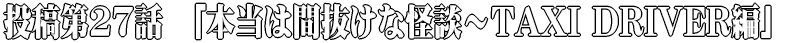 | TAXI DRIVER‘S SIDE あれは去年の5月ごろだった。 雨上がりに六本木から西麻布で中年カップルを下した後、渋谷で終電に乗り遅れた客でも拾おうかと思って青山通りに向かって走っていた。 平日の深夜、夕方の大雨ということもあってか人の気配もない静かな都心の夜だった。 青山霊園の前を抜け、青山通りにぬけようと車を進めていると、ヘッドライトに白いものが反射した。 よく見ると濡れた髪で顔はよく見えなかったが、華奢な腕を上にあげて白いワンピースを来た若い女が立っていた。 私は奇妙に思ったが、どうせ渋谷にでも行く女だろうと思い車を止めた。 止めた場所が青山霊園の前で濡れ髪の色白女。 少し気持ち悪かったがそういうのは信じないタイプなのでいつものように仕事を始めた。 「どちらまで?」 「駒沢大学の方まで、お願いします」 女はか細く消え入るような声で告げた。 よく見ると唇は真っ青で体は小さく震えていた。 日中は暑いくらいの日もあるが、まだ5月。ノースリーブのワンピースは寒いだろう。 しかしなぜ?その不自然さに嫌な感覚がした。 「お客さん、大丈夫ですか?寒そうですが・・・」 私は少し不安になり、声をかけて会話で恐怖を紛らわせようとした。 しかしその女は俯いたまま寒そうに震えていた。 会話のないまま車を走らせる。 そして駒沢公園に差し掛かった時、 「すいません、少し止めてもらっていいですか・・・」 「ええ、いいですが、もうすぐですよ。」 「ごめんなさい、どうしても降りたいの・・・」 女は消えるような声で言った。 その震えるさみしそうな声に背筋がぞくっとした。 異常な気持ち悪さを感じた私は駒沢公園の側に車を止めた。 「すぐ戻りますから・・・」 女は公園の中に足早に向かった。 先ほどは髪しか濡れていなかったが、ワンピースも濡れているようで、スカートの裾から水も滴っていた。 「えっ!」 私は驚き、後部座席を見ると、シートはぐっしょりと濡れていた。 「ひっ!」 私はパニックになり、車を出し、猛スピードで走らせた。 Girl’s SIDE 「詩織、しっかりしないさいよ!」 さやかがなびきに次のカクテルを差し出し、声をかけた。 「でも、でも・・・」 「そうそう、付き合ってわけじゃないんでしょ。そんなのフラれた内に入らないわよ。」 続けて詩織が口をはさんだ。 目をはらして半泣きのなびき。 大好きな人に彼女がいたらしく、今日はその慰め会とのことで詩織、なびき、さやかの三人で青山のとあるバーで飲んでいた。 失恋のさみしさを紛らせたいなびきとただ飲みたいだけの詩織とさやか。 お酒のペースは速く、すっかり出来上がっていた。 「泣くな!ヒィっく。わらしらち(私たち)が付いてるのら〜」 すっかり出来上がっているさやか。 何をするかと思えば、シャンパンを思いっきりふり、なびきの顔面にシャンパンシャワーを浴びせかけた。 「そうよ、なびき、そんな男、シャンパンと一緒に流しちゃえ〜、いえーい。」 「ありがとう、ヒィっく。あ〜ん、もう上着までぬれちゃったよ〜。」 といってなびきはワンピースの上に羽織っていたダブルのライダースジャケットを脱いだ。 しばらく3人のバカ騒ぎが続いた。 「うっ、きもちわりゅい・・・吐きたい・・・と、トイレ。」 足をふらつかせながらなびきはトイレに向かおうとしたが、 「にゃびき〜、さやか、オシッコ行きたい」 「わらしも〜オシッコ〜」と詩織が続けた。 そして、さやかが先にトイレに入ってしまった。 個人経営の小さなバーだ。トイレは一つしかない。 「気持ちわりゅい〜、マスターごめん、外で吐いてくりゅ〜」 なびきは足元をふらつかせながら店を出て人気のない小道で嘔吐した。 嘔吐した後、頭がくらくらと周りだし、寒気がしてきた。 頭も冷静に働かない。 「おうち、帰りゅ〜、ヒィック!」 何処をどう歩いたのか、わからないがすっかり道にも迷ってしまった。 雨上がりの5月の深夜、さすがにワンピース一枚では寒い。 ガタガタと震えもきだした。そして大量にアルコールを飲んでいるせいか猛烈な尿意も襲ってきた。 そんな時、まぶしいヘッドライトがなびきを照らした。 「おうち、帰りゅ・・・おちっこ・・・」 と幼児のようなつぶやきをしながらおもむろに右手を挙げた。 なびきはタクシーに乗りこみ、行き先を告げた。 タクシーの運転手は何か話しかけてきたが、頭痛・寒気そして猛烈な尿意で頭はぼーっとしており、ただ震えてうつむいていた。 しばらくすると気持ち悪さ以上に尿意が強くなってきた、しかし酔っていて我慢ができない。 しゅーーーーっ。 駒沢公園の近くでなびきの下着に生暖かい尿が広がった。 「はっ!」 なびきは一瞬我に返った。 そして、必死に漏れ出す尿を止めた。 しかし相当の尿が漏れていた。 なびきは尻に生暖かい不快感を感じて焦った。 そんなとき、ちょうど駒沢公園が見えた。 そして駒沢公園のトイレで用を足そうと 「すいません、少し止めてもらっていいですか