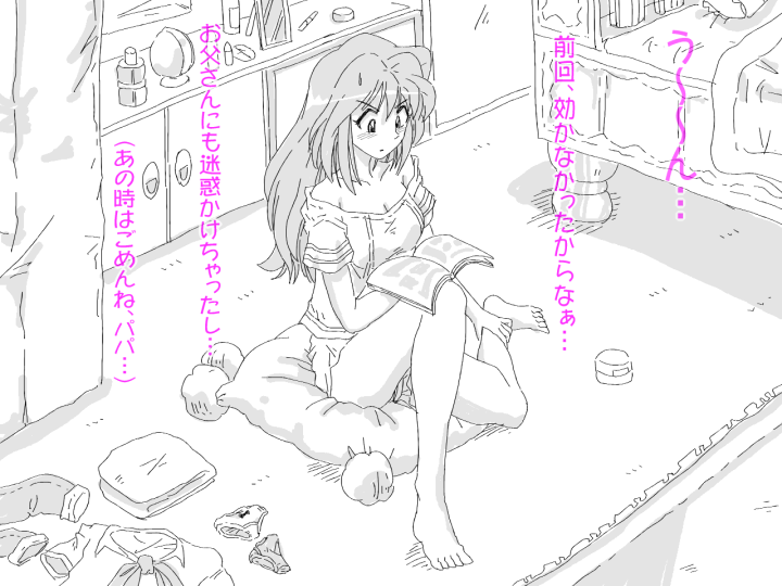 | 佑香のタンスの中にはいつの間にかに履き古した、おパンツが溢れんばかりにたまっていた もう捨ててしまえばいいのに、お気に入りだったり親友からのプレゼントだったり 母親に買って貰ったものだったのだったりで 元から物を大事にする佑香にとってみたら、とても捨てるに捨てれない大切な思いでの物ばかりなのだ ティアラ 「佑香、いつまでこの下着たちとっておくの」 「かなりくたびれているから、そろそろ捨てた方がいいわよ」 佑香 「だって、みんなお気に入りなものばかりで捨てるに捨てれないよ」 「美雪ちゃんたちから貰ったものとかあるし」 「そのうち、ちゃんと捨てるから勝手に捨てたりしないでね、お母さん」 ティアラ 「はいはい、本当に大事にしているのね、しょうがないわね」 「だけども、そういうくたびれた下着を整理するのも女の子として大事な事ですからね」 佑香「はあい」 ティアラ「それからお母さんたち、ちょっと今から用事足しで出かけるから御留守番お願いね」 そう言い残しティアラは部屋を出て行った 佑香 「あ、いってらっしゃい気を付けてね」 部屋越しで母を見送る佑香 「でも本当に、どうしよう、確かにお母さんの言う通りいつまでもとっておけないのも事実よね」 「ううん・・・こまったな・・・」 佑香はどうにかしなきゃと思いながらクローゼットの中を整理していたら バサリっと一冊の本が落ちてきた「きゃっ、なに、いったいなに」 なんだったかしらと、その本を拾い上げるとなんとその本には【おねしょ治療法】と書かれていた 佑香 「やだ、どこにいったのかと思ったらここに仕舞っていたのね」 「そういえばしばらくこれ試していなかったなぁ・・・」 もう捨ててしまおうかなと思いながらもタイトルがタイトルなだけに上手に捨てられずに仕舞いこんでいたのを思い出した 何故に佑香のような女の子がこのような本を持っているのか 実は佑香の悩みと言えば、事故の後遺症で数か月に一回程の大量のオネショと言う 大人になりかけの女子としてはとても恥ずかしい出来事に悩まされているのだ オネショをどうにか克服したいとありとあらゆる方法で色々と密かに試しているのだ しかし書いてある事は胡散臭いものばかりなのに、それでも恥ずかしさを我慢して実行した事があったのだ それだけオネショを気にしているのだ しばらくぶりに本をめくって調べてみると、まだ試していなかった治療法が目に入ってきた 佑香は思わず読み上げていたのである 【おねしょ治療必勝法 レベル15】 これまで様々な治療方法を試してこられた貴女にもっと良い方法を教えます 貴女のタンスの中には古い下着をいつまでも大事にとっといてはいませんか 確かに大事な下着で思い出の下着なのはわかりますがいつまでも置いておくのはあまり良いとは思えません だからと言ってただ普通に捨ててしまっては今まで自分の大事な部分を守ってくれていたパンツに申し訳ありません 御洗濯してから捨てようと思っても折角綺麗にしたパンツをそのまま捨てるのは更に勿体無いと感じます どうせならもう一度パンツとして役目を終わらせる為に最後に最大級の仕事をさせてあげましょう それは、あなた自身で古いパンツを履いて、そのままワザとにお漏らしをすることです 場所はどこでも構いませんが、一番安心なのはやはりお風呂場でしょう お風呂場でパンツ一枚となり鏡に向かいその鏡に映った自分の姿をみながら、 立ったままオシッコをしましょう、全部出し切るまで座り込んではいけません パンツは貴女の体内から滴り落ちるオシッコで最後に貴女との触れ合いを致します ですからけっして目をつむってはいけません、パンツが貴女のオシッコで染まるその最後の姿を 最後の最後まで自分のお漏らし姿を確りと見届けましょう そうしてお漏らしの終わったパンツを自分の手で優しく手もみで少しだけ洗い流して そのまま新聞紙等に包み後は地域のごみ分別に従い捨てましょう そうすることによりパンツに宿っていた付喪神が貴女に感謝を捧げるために 貴女のオネショの回数を次第に和らいでくれるでしょう オネショをしなくなるま、月に2回は実行いたしましょう 尚、お漏らし中のシャワーは絶対にしてはいけません、お漏らしが終わって下着を軽く洗う時に一緒に浴びましょう それを読み上げた佑香は「ほんとにほんとうかなぁ・・・」とやっぱりつぶやいていた ![]() 以前にも何回かこの本に書かれていた治療法を試してみたけど そこまでの効果がみられなかったし、「それに・・・」と、 父、諭吉にあんなお風呂につからせてしまった事を思い出し、急に恥ずかしくなってしまっていた 被害にあった諭吉はまったく気が付いていないけれど 佑香「(あの時は、ごめんねパパ・・・)」 この本の治療法をやめてクローゼットに封印をした本当の理由がまさにそれだった 「だ、大丈夫よね今回は洗い場だし、湯船じゃないし」 そう言いながら佑香はブド