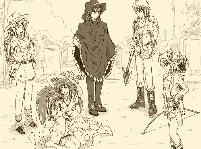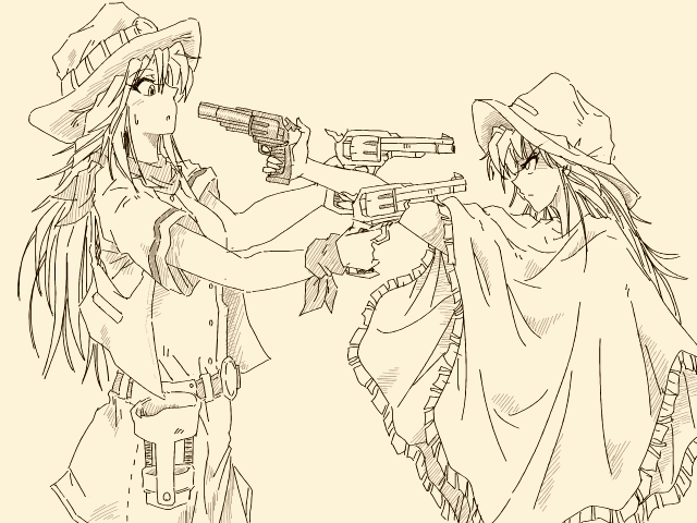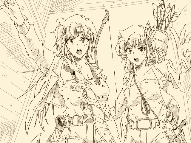 キャストラウエスタン ノワール 第2話 「二丁拳銃のマイク・グリーンフィールド」 ミゾレの店 「アンジェリカ保安官補、今日はあの賞金稼ぎさんが助けてくれたんです。私たち、彼女がいなかったら・・・」 そういうミゾレの目には涙が浮かんでいた。 アンジェリカは目線をカウンターに送った。 「黒のウエスタンハット、黒のポンチョ、黒のデニム、黒のレザーベスト・・・まさかノ、ノワール涼子!彼女がウチの町に!」 アンジェリカは大きな目をまあるく見開いて驚いた。 そして、その驚きで下着には小さな黄色いシミができた。 しかし、アンジェリカは、その驚きで下着に温もりを感じる暇もない素早さで腰からシルバーの2丁拳銃を抜きさり、涼子に向けた。 それに応えるように涼子も素早く立ち上がり黒いレボルバーを構えた。 ![]() そして涼子は「ばん!」と口で言って笑った。 「アンジェリカ・・・大きくなったな、それにいい腕だ。父親譲りの二丁拳銃も流石だな。」 懐かしそうに目を細めアンジェリカを見つめ、ホルスターに銃をしまった。 「涼子さん、お久しぶりです。2テンポ私の方が遅かった。本気だったら私は死んでいました。」 そう言って、アンジェリカも2丁の銃を腰に戻し、バーカウンターに座り涼子に話しかけた。 「もう10年ですね。父がここの保安官になってからもう10年経ちました。2年前に亡くなりましたけどね。」 と寂しそうな顔を浮かべた。 「マイクが死んだのは聞いた。でも私にはあのマイクがそう簡単に死んだとは思えない。一体なにがあったんだ。教えてくれ。レッド・コブラにやられたと聞いたが、マイクほどの腕の奴がそう簡単にやられるわけねぇ!」 涼子は興奮気味で声が大きくなった。 「わかりました。ゆっくり話しましょう。できれば一緒に墓まで来てもらえませんか。そこで話します。父も母も涼子さんに会いたがっていると思いますし・・・」 二人はゆっくり立ち上がり、店の外へ出ようとした。 その時、入り口から元気のいい声が聞こえた。 「こんにちわぁ、ミゾレさん大丈夫でしたか!」 「こんにちわぁ、ミゾレさん大丈夫でしたか!」 ![]() この町はずれのインディアン部族・リングレア族の娘二人だった。ショートパンツのような衣服を身にまとっていたので、その健康的なふとももはあらわになっていた。 革製のブーツに肌の露出の高い衣服。そしてスウェード地の長袖のジャケットを羽織っていた。 髪の長い方は腰にトマホークを携え、数枚の小さなナイフをたすきの用なものに差し肩から掛けていた。 髪の短い方は背中に弓矢を背負って左手に弓を持ち腰にはダガーを携えていた。 彼女たちと入れ違えるように涼子とアンジェリカは店を出た。 「昨日、レッド・コブラの奴らに襲われたって聞いて・・・私たちに何かお手伝いできることありますか?」 髪の長い娘がミゾレに言った。 「ありがとう。リナちゃん。大方、片付いたし、ケツさんも命に別条がないようだったわ。二人はショックを受けているけど、私が何とかするわ。」 「私たちにできることがあれば何でも言ってくださいね。ミゾレさんは一番のお得意様なんですから」 髪の短い方が少し悪戯っぽく応えた。 「ありがとう・・・」 ミゾレはうれしくて涙が溢れそうになった。 どうやらこのインディアンの双子の娘は干し肉をミゾレの店に卸している様子だった。 町はずれの墓地 「マイク・・・」 涼子はそう言ってバーボンを取り出し、墓にかけた。 隣で厳しい顔をしたアンジェリカが話し始めた。 「あれは2年前・・・父と保安官補のジェイク、そして私の3人で、レッド・コブラ一味が誘拐した旅の娘を救いにいったときでした。 ジェイクと父はまだ保安官補になって間がなかった私をアジトの外に見張りに立て、中に入っていきました。 今思えば、ジェイクに強く外で待つように言われたと思います。 銃撃戦になる可能性が高かったので私をその危険に巻き込みたくない。そう言って私を引き留めました。でもその言葉には嘘はなかったと今でも信じてします。 でも、それが罠だったというか・・・中に入ってみると誘拐されたはずの娘はレッド・コブラの幹部の女でした。ジェイクとその幹部の女は内通していたのです。そして、ジェイクは父を裏切り、彼によって頭を撃ちぬかれて死にました。」 そう言ってアンジェリカは空を見上げ、こぼれそうな涙をこらえた。 「今ではジェイクはレッド・コブラの幹部。でもあの優しかったジェイクがなぜ父を裏切ったのか今でもわかりません。そして母は、父が亡くなったことと信頼していたジェイクに裏切られたことで1年後病でなくなりました・・・。隣の墓は母のものです。」 そう言ってアンジェリカが目線を落とした先には、ミサト・グリーンフィールドと名前が彫られていた。 「ひでぇ話だ・・・しかし、マイクやミサトさんが信頼していたそのジェイクとかいうのが裏切ったというのが解せないな。マイクの人を見る