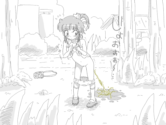 | 7月×日 今日は学校で写生会があったよ! 外の絵をかいたりするのって結構楽しいね トモちや小粒ちゃんと並んで公園のすべり台かいて三人で見比べたりしました! それはそれとして来週までに宿題も出されちゃった… なんでも「写真を撮ってきてそれを教室で描くように」 って言われちゃった… しょうがないから午後から色々見て回ってたんだけど… 暑くて暑くてしょうがない!限界だったから公園のお水がぶ飲みして ついでにアイスまで買っちゃった!それで色々見て回ってたらいいのを発見! セミが止まってる木があったんだよ!「これだ!」って思って 撮ろうと思ったんだけど逃げられちゃって…しょうがないから またセミが来るのを待つことに。この大きな木にセミが止まるのを狙いたかった からじっくり待つためにアイスとか食べてのんびり待ってたんだけど… ここで問題発生。 …トイレに行きたくなっちゃった! うう…お水とアイスがお腹をぎゅーぎゅー締め付けて来るよ… でもベストショットを狙いたいから必死にガマン! すぐそこにトイレもあるし大丈夫だと思って足をもじもじ揺らしてたんだけど… 10分、20分、30分… (いつまで待たせるのよセミ―!!早くおしっこさせてよー!) ぜんっぜん来ない!この暑さなんだから来てもいいじゃない! もう足を揺するのじゃ持たなくてスカートを直接ぎゅって手で押さえてたの。 もうおトイレに行くべきだったんだろうけど… (絶対撮って、おしっこしてやるんだから!) その時すっごく頑固になってた私はシャッターチャンスをずっと待ってた。 もうスカートを押さえてても我慢出来そうにないからスカートから中に手を 入れて直接押さえたりして、それでもまだ来なくて… (もういいから、おしっこさせてよお!) 動かないと漏れちゃうところまで追い詰められちゃったんだけど… ミーンミーンミーン… (来た!!!!) セミの鳴き声がして振り返ると気に止まってるセミがいた! これで後は撮影すればおしっこ出来る! そう思った私は一瞬だけだけ腕をお股から引き抜くと カメラ機能を使って何度も撮りまくった… 「こ、これでいいよね?んっ!」 押さえてた腕がなくなったお股から少しずつ湿った感覚がするような気がして、 もうボタンの位置とか細かい事気にしてらんなくって 脱ぎかけのスカートとパンツを引っ掴むと、急いで草むらの中に入った。 (だって、トイレに行く時間もなかったから仕方いんだモン…) お尻からぴゅって今にも出そうなのをこらえて走る私。 (後ちょっと後ちょっと漏れちゃう漏れちゃう漏れちゃう!) おしっこをたっぷんたっぷんに入れたお腹はとっくのとうに限界で、 しゃがむのも間に合わなくてちゅーとはんぱにお尻を突き出した 変な格好のままおしっこが出ちゃった… 「びしゅーっ」とか「しゃしゃしゃーっ」って音がしたんだけど 私はお構いなし。おしっこが凄く気持ちよくて、スーッとお腹が軽くなる のがくせになりそうなくらい幸せな気持ちだったの。 ![]() (ちゃんと撮れてるかな…私、今セミみたいな事してる…んんっ…) こんな事考えて、おしっこ全然止まんなかった… 取り合えずおしっこし終わった後に周りを見てみたんだけど… 見事に水溜りが出来てた。私こんなにやっちゃったってたんだって思っちゃった スカートとパンツは無事だったから履いたけど、少しちびっちゃったかも…? 取り合えず見つかるとまずいし、もう草むらからは出たんだけど… 「あ、あれ…これって!?」 セミは無事に撮影出来てたんだけど、ちょっと問題が… 何と最後の写真に私がおしっこしてる所がうつちゃってたの! ボタンを適当に押してたから時間差モードみたいなのが最後に出ちゃって、 運悪く角度があっちゃって私のお尻(残りは草で隠れてた)とおしっこを ばっちりと… 「こ、これどうしよう…?」 取り合えず宿題は終わったんだけど…うん、この最後の写真は… な、何か見てると意外と…うん、いいし…ちょっとだけなら データ移しても大丈夫だよね…? 後で元のデータだけ消しとけば…うん、いいよね! えへへ、ちょっといけない事してる気分でドキドキするな♪ |
