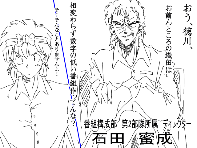| キャストラTV 制作局内休憩室 夕方のニュース番組が終わり、ひと時の幸せを得に、徳川は休憩室の自動販売機で香り立つコーヒーを入れていた。 そこに野太い声が聞こえる。 「おう、徳川、お前んとこの織田は相変わらず数字の低い番組を作ってんな?」 振り返ると第2部の石田蜜成ディレクターだった。 ![]() 「そんなことありませんよ・・・・といいたいのですが、最近はネットに押されっぱなしで・・・それに視聴者からのクレーム対応ももうほんと大変ですしね・・・」 徳川はコーヒーを取り出し、カップを口につけた。 徳川の鼻の周りに香ばしい匂いが広がり、彼はひと時の安らぎを得た。 「そうだな、織田は報道が中心だからまだいいが、俺はバラエティー班だから、年々厳しくなる放送コードがきついわぁ、昔は多少、羽目外しても数字さえ取れれば上もスポンサーも大目に見てくれたが、今はコンプライアンスとか言ってがんじがらめ・・・ちょっとお色気路線でもやるともう袋叩きだぜ・・・はぁ」 石田は疲れたようにため息をつき、たばこに火をつけた。 「そうですね。最近はハプニングでもない限り視聴率は跳ね上がりませんからね・・・」 徳川もお手あげといった表情で愚痴った。 「そうだな。悲しい話、去年の瞬間最大視聴率は、7月の新人アナの・・・えっーと誰だっけ?」 「和久ちゃんでしょ。和久いずみ!」 名前を思い出せないで言葉に詰まる石田に、徳川は間髪入れずにそういった。 「そうそう、あのショートカットの新人ちゃん、それと9月のクロエの『おもらし』のハプニングだからな・・・二人のお漏らしのあと、急激に視聴率があがり、うちの去年の瞬間最大視聴率とは・・・とほほな結果だな。」 「そうですね・・・昔は勢いありましたね。そういや、『ミッドナイトエンジェルス』をYOU TUBEでみましたよ。あれは本当にエロかったですね。リアルタイムで観たかったな」 徳川は笑いながら懐かしそうに言った。 「応!あれは俺も織田もまだ下っ端のADだったな。あの頃は自由だったぜ。」 「そうそう、『ミッドナイトエンジェルスの本物は誰だ!』とか好きでしたね。ホントエロくて(笑)。出てくる女の子も素人さんだけどかわいくって・・・この中でオシッコを我慢しているのは誰だとか面白かったですね。」 「おっ、君も通だね。」 石田は嬉しそうに笑ってつづけた。 「クイズ番組の一問目が、この5人の中でオシッコをしている子は誰だってやつで、その答えはクイズ番組の途中で我慢しきれず、トイレに駆け込んだ子が正解ってやつな(笑)」 「そう、それです。さすがに地上波だったので、音消しはされていましたが、放尿している女の子の表情はしっかり映されていて、めっちゃ興奮しました。」 「あれな、何本か漏らした女の子いただろ」 「ええ、それも放送されていましたね。今だと大クレームですね」 「でもな、放送されていないものもあってな。今や大女優も駆け出しのころ、あれで漏らしてんだよ。まぁ大きい事務所だったので、おもらしは将来に響くと思ったのかお蔵入りになったけどな。名前聞いたらびっくりするぜ。」 そういって石田はニタニタと笑った。 「えー、誰です?気になる〜、あの番組が終わったのが15年前だから・・・15〜20年経ったとして・・・35〜40歳前後の女優さんですよね?」 「それは、言えないな。」 「えっ〜、吉岡美咲とか」 「バカ、彼女はまだ20代だろ。」 「そうか・・・誰だろ・・・気になる〜。」 徳川は興味津々だった。 「あと、どストレートに『オシッコ我慢大会』もやっていましたね。あれはアウトでしょ。」 徳川は苦笑いしながら言った。 「あれは、『ミッドナイトエンジェルス』の末期だな。マンネリで視聴率が落ちてきてな。本物は誰だでおもらしがあると視聴率があがったので、思い切ってやってみた。まぁ女性団体とかからは猛烈な抗議があって、あれ一回こっきりだけどな(笑)」 「数年前に動画がアップされていたのですが、あれはもうアップされてないですね。」 「ああ、あれは今も活躍するモデルのジュディ・ブラナーもいるしな。事務所が圧力をかけたんだろ。それにあれに出てた、当時、女子高生だった倉木理美(くらきさとみ)な、今は結婚して、西方って名字が変わってるけど・・・」 「えっ!あの経理の西方さんですか!」 徳川は驚いた。 それもそのはず、当時、ガングロのコギャルだった倉木は、今は色白・黒髪のお淑やかな美人になっていたからだ。 「そうだよ。まぁあの番組に出るくらいだから、普通の感覚じゃないよ。気は強いし、仕事もできる。でも流石に大学卒業して、内に入社した時は驚いたけどな。だって小便ちびった映像を見ている人が何人もいるんだぜ、大したもんだ。」 「え〜っ、あの西方さんがあの女子高生だったなんて、めっちゃ興奮します。スカートの前押さえながら、ちゅーっって漏らすシーンとかめっちゃエロくて・・・今度、経理に行ったとき西方さんの顔み