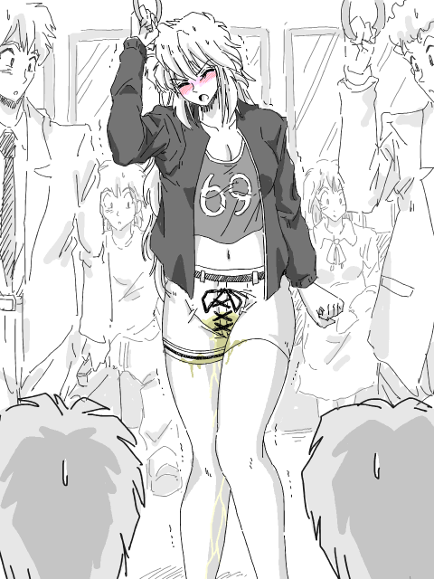 | 最終電車にご用心!アンジェリカ、ハロウィンナイト篇 CC2019年10月25日(金)深夜1時ごろ、閑静な住宅街に大柄の女が抜き足、差し足で大きな家の門扉を開け、玄関ドアに近づいて行った。 その女、竹俣アンジェリカ碧は、そっと、玄関ドアのカギ穴にカギを入れ、音を立てないようにゆっくりと開けた。 深夜に帰ったことを家族に気付かれたくないのだろうか、彼女は忍び込むように家に入り、電気もつけず、ゆっくりと進んだ。 彼女は2階にある自分の部屋に向かわず、奥のバスルームへと向かった。 そっとバスルームに入ると、あたりを警戒しながらそのドアを閉めて、電気をつけた。 脱衣場に灯りがともると、アンジェリカの姿が鏡に映った。 ハロウィンのコスプレ姿の上に防寒対策で羽織った黒のMA−1が印象的だった。 コスプレはホットパンツのチアガールだった。 そして、その白のホットパンツの股間は黄色いシミが扇形についていた。 そう彼女はお漏らしをしていたのだった。 健康的な太ももの尿はすっかり乾いていたが、股間のシミは少し乾いて黄色さが目立ってきていた。 「いやだ〜・・・」 アンジェリカは、自分の股間にしっかりついた扇形のシミをみてがっくりと肩を落とした。 「また漏らしちゃった・・・もう二十歳になったのに・・・どうしよう・・・また治療に行かなきゃ・・・」 そう呟きながらゆっくり、MA−1を脱ぎ、ホットパンツの紐をほどき始めた。 「もう、こんな面倒な衣装にしなければよかった・・・」 そう言いながら白のホットパンツを脱ぎ捨てると、しっかりとお漏らしジミの付いた白いパンティが露になった。 「どうしよう・・・今、洗濯機回したらバレる・・・かな・・・今日は、お父さんも帰ってきているし・・・」 アンジェリカはしっかりシミの付いたホットパンツとパンティを見ながら一瞬悩んだが、服を脱ぎ、パンティも脱いで浴室に向かった。 そして、浴室でパンティとホットパンツも洗うことにした。 かなりのシミにはなっていたが、まだ乾ききっていなかったので、おもらしジミはほぼ完ぺきに洗い流せた。 アンジェリカはほっととため息をつき、体を洗った。 そして、今から1時間ほどの前の出来事を思い出していた。 「みんなに見られちゃった・・・・」 1時間ほど前、渋谷駅 「美樹先輩、私は終電があるので、先に行きますね。」 アンジェリカは、トイレの前で、ガンマンの恰好をした加藤美樹にそう声をかけてホームに向かった。 女子トイレはコスプレをした女性で長蛇の列だった。 しかも最終電車近くで、みんなお酒も入って、尿意に身もだえる女子も多くいた。 中には豪快に失禁している女子もいた。 ちゅぃーーーーーっ! 「りんごちゃん!」 女子大生くらいのきつめのかわいい女の子が、小悪魔の衣装を着て、豪快に失禁していた。 ぶるっ! 加藤美樹はそれを見てブルった。 「ごめん、私は終電を諦めて、トイレ済ませてから帰るわ。もう限界なの。タクシーで一緒に帰る?」 加藤美樹の方は、切羽詰まっているらしく、腰をくねくねとしながら、時折、股間を押さえていた。 「美樹さん、私は学生だし、お金もないから、終電で帰りますね。内は渋谷から15分ほどだし、我慢できますって!」 そう言って、美樹と別れて、電車に駆け込んだ。 そうたった15分だった。 しかし、アルコールの利尿作用は、二十歳の女性の膀胱の臨界点にまっしぐらに作用した。 電車に乗って5分も経たないうちに、アンジェリカの尿意は猛烈なものになった。 膀胱から尿道にかけて、ズドーンと重くのしかかるような不快感がアンジェリカに襲った。 彼女はつり革を強くつかみ、太ももをぎゅっと絞めた。 アンジェリカの前に座っているオジサンは、自分の娘ほどのアンジェリカの健康的な太ももにくぎ付けになっていた。 もちろんその隣に座っているスワットのコスプレをした男子大学生もスタイル抜群のアンジェリカにくぎ付けだった。 「視線を感じる・・・」 アンジェリカは、今すぐにでも股間を押さえて、尿道口に蓋をしたかったが、まわりの視線は気になってできなかった。 露出度の高い衣装に、スタイル抜群で健康的なアンジェリカは注目を集めてしまっていた。 渋谷駅をでて10分ほどが経った。 電車がこの駅を出れば、自宅のある駅だが、尿意はもう限界に近い。しかし、その尿意に負けて、この駅のトイレに駆け込むと終電を逃す・・・ アンジェリカは迷ったが、あと5分なら何とかなると思って、我慢することにした。 しかし、この判断が大きな誤りだった。 電車の揺れにあわせて、アンジェリカの下腹部に衝撃が伝わった。 額や首筋に脂汗が吹き出てきた。 そして、健康的な太ももには鳥肌が立ち始めた。 「まずいなぁ・・・漏れちゃいそう・・・あっ!」 必死に股を閉じて、大陰唇をすり抜けようとする尿を堰き止めようとしていた。 じわっ・・・じわっ・・・ 生暖かいものが少しづつ、アンジェリカの大陰唇の間をすり抜ける感覚が