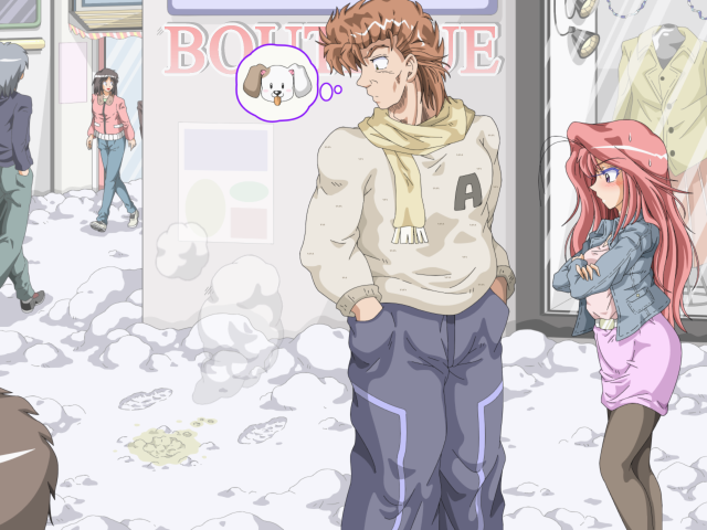 | 【12月のある日】 (最近寒くなってきたわね…そろそろ着られなくなってきた服もあるし、 新しい服とか買わないと…そうだ!) きっかけは些細な事、りんごが冬服を買いに行こうと思った際にちょこっと 思いついた「二人でお出かけ」プランを思いついた事だった――― 「正昭、ちょっといい?」 「はい、何でしょう会長?」 「明日、用事とかない?」 「ええ、ありませんが…」 「それなら…明日私の買い物に付き合いなさい。」 「つ、付き合う、ですか…それは…」 「か、勘違いしないでよ、正昭は荷物係兼見学よ。 ちょっと新しい冬物の服を買いたくて、 男の目線でどんな服がいいのか見てほしいってだけ。分かった?」 「了解です。それなら集まる場所も決めておきましょうか。」 「ええ、そうね。それなら時間は10:00に集合で―――」 【〜その日の夜〜】 「明日は何着ていこうかな…正昭なら何着ても文句は言わないでしょうけど、 どうせなら綺麗に見られたいし…迷っちゃうわね…♪」 8:00(PM) 明日のデー…外出に向けて入念に準備を進める。服についてかなり悩んでいた。 「う〜ん…これがいいかしら?それとも…う〜ん…」 10:00 まだ悩んでいる。かなりの数の服を選んでは変えての繰り返し。 「…zzz…」 11:00 ようやく選び終わり就寝。この時点でいつもより就寝時間が 2時間程遅れていた。 【翌日】 「…zzz…あ、あれ…もうこんな時間……なんで…あっ!!」 9:00(AM) 目覚まし時計をつけ忘れていたため本来起きる時間よりもかなり遅く起床。 「りんご〜、そんなに急いでどうしたの〜…?」 「ちょっと今日友達と約束してて…急いで着替えないとっ!」 9:10 慌てて支度を始める。朝食を取りつつ 姉のなびきと朝の挨拶をして、化粧と着替えを何とか終わらせる。 「ちょっと行ってくるわね!」 「うん、行ってらっしゃい…デート頑張って…」 「で、デート!?ち、違うわよ!」 (トイレ行きたい…けど、向こうでも行けるわよね…) 9:30 まだ寝ぼけたままのなびきに見送られながら何とか準備を整えて外出。 この時点で夜から朝まで出せていない尿意を自覚するもトイレは後回しにして 佐竹との合流を優先する事にした。 【服屋の前】 「着いたわね…これなら佐竹が来るまで待てるかしら。 (ちょ、ちょっとトイレに行きたいかも…でもまぁ正昭が来てから行けばいいわね。) 9:40 市内の服屋に到着。まだ10時前のためか人はまばら。 雪の降り積もる中服屋のショーウィンドーの前で佐竹を待つことにする。 冬の寒い時期に外出したためかお腹が冷えかなりトイレに行きたくなっていたが 佐竹が来るまで我慢しようと考えつつ足踏みを始めた。 タンッ、タンッ、タンッ… (け、結構きつくなってきた…早く来なさいよ、正昭…!) 9:43 加速度的におしっこが溜まっていく感覚に襲われるりんご。 早く佐竹に来てほしいもののまだちょっと余裕があるので我慢中。 足踏みが少しずつ早くなってきた。 タンタンタンタンタンタンッ… (フリフリフリッ…) 「っ、ふぅぅぅぅぅっ…!」 (も、もうダメ…トイレ、に… でもトイレに行ってる間にもし正昭が来たら… 大丈夫、耐えるのよりんご、来たらすぐに適当に言い訳してトイレに…!) 9:46 かなり尿意がきついためトイレに行く事を考えるも 佐竹とすれ違う事を考えて何とか我慢しようとする。 足踏みが加速し、無自覚に腰を左右に振って尿意を紛らわせようとしている。 「は、早く、来なさっ…」 チョロロロッ… 「あっ…!だ、ダメェッ!」 (も、もう無理、間に合わない…!もう、出ちゃうっ…!) ダンダンダンダンダンッ!! (シュルルル…) 9:49 早く来ないかと我慢との板挟みでイライラしていた所、 ほんの少しだけ膀胱が緩んでしまいおちびりをしてしまう。 暖かい感覚に襲われながら、もう我慢できる状態ではないと判断したりんごは 何とか残りを漏らさないようにとガッチリとアソコをスカートの上から握りしめ 足踏みをしながら黒のタイツをゆっくりと下ろしていた… (シュルッ…!) 「もう限界っ!出ちゃう〜〜〜〜〜〜〜〜〜〜〜っ!!!」 プッシャアアアーーーーーーーーーーッ!!! ジョロロロロロロロ〜〜〜〜〜〜〜〜ッ! 9:51 黒タイツを慎重に膝まで下ろし終わった瞬間、 りんごはしゃがみこむと店にお尻を、反対側にアソコを向ける形でしゃがみ 勢いよく放尿を開始。おしっこの着弾地点の雪を勢いよく削り取りながら 雪の上に水溜りを広げていく… プシュイイイイーーーーーーーーーーーーーーッ!!! じょぼじょぼじょぼぼぼぼぼぼぼぼぼぼぼおぼぼぼぼ……… じょわわわわわ〜〜〜〜〜〜っ………… 「んっ…はあああああっ…………」 9:52 一分経過するも激しさを増すおしっこ。 凄まじい勢いで雪に飛び散ったおしっこが崩れてきた雪を 溶かし、最初に着弾した地点は地面が少しだけ見えるほど貫通してしまっている。 何とかおもらしを免れたりんごであったが、服屋の前でお尻を出して しゃがんで出すというかなりリスクに満ちた行為への焦りや恥ずかしさは 解