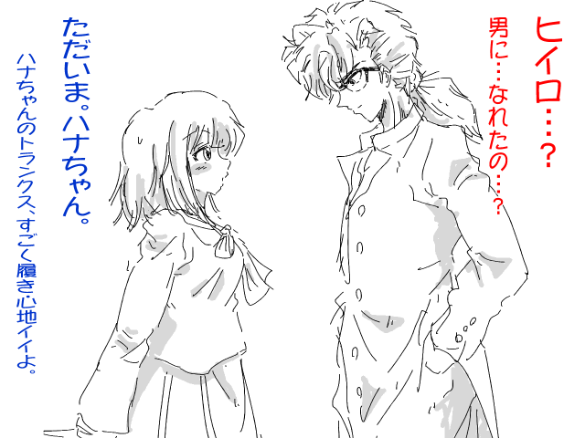 | 或る日の放課後サークルの部室にて セーラー服姿のハナちゃんが部室に入るなりヒイロに駆け寄っていた ハナ「ヒイロ、ヒイロに絶対似合うのあったから買ってきちゃった、はいプレゼントだよ」 ヒイロ「え、いいのハナちゃんありがとうお小遣い大丈夫? なにかしら? 今、開けてもいい?」 ハナ「いいよ、今ならまだ大丈夫だよ、男子たちが来る前に早く開けちゃって」 ヒイロ「どれどれ、あら可愛い猫ちゃんの・・・やだ、トランクスじゃないのこれ」 ハナ「だってその猫柄すごく可愛かったんだもの」 「大丈夫だよ、私も今それと同じのを履いているから」 とハナちゃんは丈が足首くらいまである長い自分のスカートをまくしあげていた ヒイロ「やだ、ハナちゃんったら早く隠して隠して、男子たちが来ちゃうよ」 ハナ「ヒイロも早速それを履いて見せてよ、絶対に似合うと思うよ」 ヒイロ「え、今から?」 ハナ「はい、いまからです」 ヒイロ「そう、それならちょっと、うーん・・・」 今その場で履こうとしたら ハナ「パンティの上に履いちゃだめだよ」 ヒイロ「うん・・・、わかった、じゃぁ着替えてくるね」 部室を出てお手洗いに向かった そこへ、蓮昇達が入ってきた 蓮昇「ハナちゃんおつかれさん、今日も捗っているかい」 「(おや、今日はセーラー服か・・・)」 ハナ「潜龍路先輩お疲れ様です」 「ハナちゃんもう来てたんだね」谷と植木が入ってきた 谷「あれ、いぬヅかさんは?」 ハナちゃん「お花摘み・・・」 谷「そっか、じゃ、いぬヅかさんが来るまで待つとするかな」 蓮昇「そうだな犬塚さんが来てから作業開始とするか」 犬塚さんが来るまで他愛のない話をしているメンバーたち 植木「それにしてもハナちゃんって犬塚さんと仲が良いよね」 谷「ほんとだよな、ちょっと妬けるくらいだよ羨ましいな」 ハナ「私のヒイロに手をだしたらダメよ」 谷「まいったなぁ、いぬヅかさんを好きになるにはハナちゃんの許可が必要になるのかな」 植木「まるで、お父さんみたいなガードだなぁ」 谷「ほんとうにハナちゃんは、いぬヅかさんの事が大好きなんだね」 ハナ「私には夢があるの」 植木「なんだよ、急に」 蓮昇「苗字が簡単な人との早めの結婚の事だろ?ハナちゃん」 ハナ「それとは・・・、別な奴」 蓮昇「気になるな、教えてもらっても差し支えない事かい?」 ハナ「はい、もしも世の中に本当にドラ○ンボールがあるとしたらばの話です」 植木・谷「なんだそりゃ」二人そろって軽くハナちゃんの頭をこづく ハナ「そのボールを探して集めて、龍神へあるお願いをするの」 谷・植木「ふむふむ、それは?」 「(まさかお兄(安斎)さんに会いたいとかじゃないよね)」と思った蓮昇 ハナ「それは、ヒイロを男にして貰い、ヒイロと結婚して妻として生涯尽くしたいの」 「そうしてヒイロの子供を産むの!」軽くガッツポーズをしているように見えた ガクンっとコケた感じのする蓮昇 「お前が男になるわけじゃないのか、いぬヅかさんにとても迷惑だろう!」 「お前が男になるわけじゃないのか、犬塚さんにとても迷惑だろう!」 と谷・植木が再びハナにツッコミをいれる ハナ「だって私が男になってもイケメンにはなれないし、外では働きたくないし」 「生涯女としてヒイロに尽くせる自信はある、ヒイロなら間違いなく超絶イケメンになれると思う」 植木「なんだそりゃ、ハナちゃんの考えている事は時より解らないことだらけだなぁ」 谷「まさか、その話を本人に話をしたりとかしてないよね」 ハナ「出来るわけないよ所詮かなわぬ夢、そんな話だから私は普通に男の人を探し求めてるのよ」 そういいながらイケメン俳優特集などの雑誌を取り出す 蓮昇「でも、苗字が簡単な人が先ず第一条件なんだろう」 ハナ「そうなんですけどねぇ、なかなか・・・」そう言いながら谷の顔をじっと見ているが どういうわけだか深いため息をついたようにも見えた 谷「な、なんなんだよいったい・・・??、・・・そ、それにしてもいぬヅかさん遅いなぁ」 ハナ「谷のえっち! 女の子のお花摘みをせかしちゃダメだよ」 「色々と気づかいもしなと」 谷「いやいや、そういうわけじゃないよ」 その頃、廊下では ヒイロ「やだ、みんなもう来ちゃってる、ちょっと部室に入りづらいな大丈夫かな」 当然であるスカートの下はトランクス、女性物の下着と違って とにかく風通しが良い気がしてて、オマケにある部分の生地と生地の縫い目が ちょうどアレにあたり擦れてなんとも言えない刺激が加わっているからだ ヒイロ「やだなぁ、鼓動がとまらないなぁ体が火照ってきた、レン君達に気が付かれなきゃいいけど」 それにしてもハナちゃんったらいくらネコ好きだからって 男性物の下着でなくたって、でもこのネコのイラスト凄く可愛いなぁ 思わず欲しくなるのも確かに頷けるわね ふふ でもハナちゃん今日は朝からコレを履いてきているのよね しかも学ランでなくセーラー服にスカートだなんて、どう