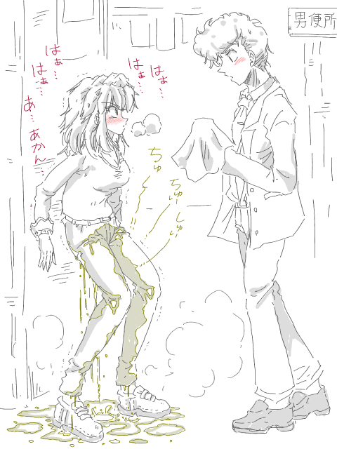 | CC2021年4月14日 都内某所 「明智編集長!政治部との懇親会って!なんで西条となんですか!」 真桜は頬を膨らませてテーブルに手をついて、その形のいい尻をツンと突き上げながら明智に迫った。 「まぁまぁトウグウ。そうよね〜同期でも、私は東大卒で、美人で、しかもあなたが行きたかった政治部の記者だもんね〜」 真桜の目の前に座った細身の女が黒髪のストレートヘアをかき揚げ、彼女を嘲笑するような表情で言った。 「西条〜っ!てめぇ!」 「あら〜、本当のことじゃないの〜。社会部のトウグウさん(笑)」 頭に来た真桜は目の前のジョッキのビールを一気に飲み干した。 「すいません!お代わり!」 真桜は空いたジョッキを高く上げて、店員を呼ぶように叫んだ。 二人は同期。二人ともキャストラ新聞社の中でも群を抜いた美人だが、お互いが負けず嫌いでいつも張り合っていた。 「西条〜っ!学歴やないねんで!社会人は実績や!実績!お前は政治部でスクープないやろ!」 「何!」 西条美奈はその図星にこめかみに青筋を立てて、黙ってジョッキをもってビールを一気に流しこんだ。 「すいません!こっちもお代わり!」 二人はこの後もけん制しあって、ガンガンとビールを飲みほしていった。 『マジか…こいつら…黙っていれば二人とも美人なのに…管理職はつらいよ…』 明智光正は頭を抱えた。 「編集長…顔色悪いですよ。」 隣にいた環希理奈の一言が天使のささやきに聞こえた。 それからしばらくたって、理奈がトイレに立った。 ジョッキを片手に口論を続けていた二人だが、かれこれビールをジョッキで7,8杯は空けており、二人の膀胱はかなり大きく膨らんでいた。 「ちょっと、トイレ。」 西条美奈が先に席を立った。 「私も」 真桜もつづいた。 「何、ついてきてんのよ!」 「うるさいねん。行きたいもんしゃーないやん。」 二人はそういいながら奥のトイレに向かっていった。 しかし… 「あっ、東宮先輩、西条さん。トイレ一つしかなくて、結構、並んでいるんですよ。なんか最初の人、全然、出てこなくって。」 理奈は振り返って二人にそういった。 その言葉は二人の背筋に冷たいものを走らせた。 『マジか…、結構、漏れそうなのに…しかし、トウグウには知られたくないな。ここは何事もないような顔で…』 『やばいで…こいつの前でオシッコ我慢してるとか思われたないわ』 「あらそう」 「あらそう」 二人は声をそろえてそう答え、余裕の表情を作った。 二人は張り合って飲むあまり、尿意をギリギリまで我慢してしまっていたのだ。この時点で二人の水風船は破裂寸前だった。 美奈は気づかれないようにその細い太ももをきゅっと閉じ、スカートの上から尻を撫でた。 『マジか…ビール飲みすぎちゃった。ホント漏れそう!うっ…』 大きな尿意の波が美奈を襲ったが、これは何とかしのぎ切ったようだった。陰裂の奥が熱くなる感覚だった。 『あかん、あかん!私、ビール飲んだらめっちゃオシッコしたなんねんなぁ。漏れる〜っ』 真桜もスラックスのベルトきゅっと引っ張り下着を陰裂に食い込ませるように尿意を堪えていた。下着が陰裂に当たって少し気持ちよかった。 「あの、お二人とも大丈夫ですか?私、まだそんなに行きたくないから順番、変わりましょうか?」 二人の切羽詰まった雰囲気に理奈は気遣った。 理奈のその言葉に二人はぎょっとした。 尿意を堪えていることなど傍目には気づかれないようにクールに我慢していると思っていたのだが、限界寸前の若い女性の危機感と悲壮感は端から丸わかりだった。 「だ、大丈夫よ、理奈ちゃん、わ、私はまだ我慢できるから、先使いなさい。」 美奈は声を震わせながら答えた。 「そ、そうよ。私も全然、平気!うっ…」 真桜も内股になりながらも、答えた。しかし、その時、真桜の外尿道から10CCほどの尿がぴゅっと噴き出て、大陰唇をすり抜け、パンティにジワッとぬくもりとして広がった。 「な、何、強がってんのよ。譲ってもらいなさいよ。この歳でおもらしなんてありえないわよ。」 美奈も限界ギリギリなのに、マウントを取るように苦しむ真桜にプレッシャーをかけた。 「何ゆーてんねん。あなたこそ、顔色悪いわよ!」 負けじと真桜も強がりを言った。そして美奈はその言葉に顔を赤らめた。 「わ、私がこの歳でおもらしなんてするわけないわ。」 美奈は極力涼しい表情を作ったが、こちらも膀胱はパンパンにはっており、衣服の上からもその下腹部のふくらみが分かった。そして、足は少し震えていた。 『なんか変な雰囲気になってきちゃったな…』 理奈は二人に挟まれいたたまれなくなっていた。 二人はモジモジと必死に尿意を堪えていた。 『うっ…でる…』 美奈がそう思った瞬間、全身に鳥肌がたった。そして、すっーっと股間から何かが落ちそうになった。 「あふっ!」 その瞬間、反射的に、美奈はスカートの上から右手で股間を鷲つかむようにおさえた。 しかし… じゅわっ… 美奈の下着と恥丘の間にぬるぬ