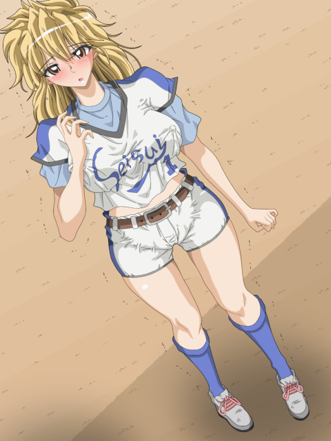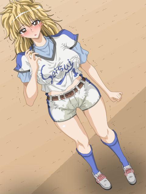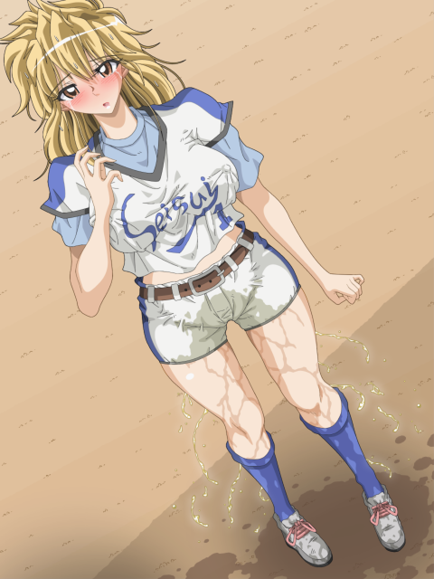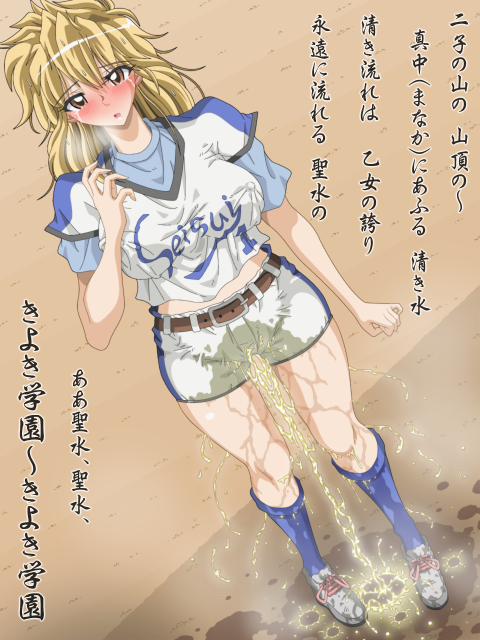 | 第9話 優勝の瞬間、本来ならみんなピッチャーマウンドに駆け寄って大喜びするのだが、失禁するまで戦い抜いた聖水ナインにはそんな余力もなく、がっくりとその場にへたり込むものや、呆然と立ちすくむものばかりだった。 ただ一人、アンジェリカだけは額に脂汗を浮かべ、小刻みに体を震わしながら弾力性のありそうな健康的な太ももを固く閉じて尿意を堪えていた。 「さぁ、校歌斉唱だよ。」 審判に声をかけられ、みんなよろよろと歩き出し、整列した。 さやかは精魂尽きた体にむち打ち、キャプテンとして大きな声を上げた。 「みんな!最後はしっかり締めるよ!」 そういって、気を付けをして整列の先頭に立った。 「おっー!」 聖水ナインはその声に応じるかのように胸を張って、校歌斉唱の体制に入った。 ずらっと並んだ美女たちの健康的なユニフォーム姿はそれだけで美しかったが、彼女たちの股間や尻、ソックスにしみ込んだ尿がエロさを助長していた。 (解説) 『うほっ!今日の試合録画しておいてよかった…今晩のおかず…いやメインディッシュ!』 弾昆は股間をガチガチさせ整列する美女たちの失禁痕をいやらしい目で見ていた。 彼女たちは、失禁して時間も経っていたので、みんな濡れた下着や衣服を気持ち悪そうにモジモジとしていた。 ユニフォームのパンツの裾を何度も引っ張っている美樹や痒そうにふとももをモジモジさせる彩、また真桜は失禁時の体制が悪く、しっかり胸まで濡れていたので、パンツの裾を引っ張るだけでなくユニフォームの襟を引っ張ったりしてその不快感を和らげようとしていた。そんな姿もどこかに恥じらいがあり、それがまた失禁のエロさを増幅させていた。 これは弾昆でなくともうれしい光景であった。 その中で、アンジェリカの股間だけは、小さなシミはできていたものの、まだ決壊を免れていたので失禁痕とわかるものがみんなより目立っていなかった。 しかしそんな彼女にも刻一刻と失禁の恐怖が押し寄せてきていた。 そして、そんな中、校歌斉唱が始まった。 みんなきちんと気を付けをして校歌斉唱にのぞんだ。 ジャーチャチャン!ジャーチャチャン!チャチャチャ… イントロが流れ始め、校歌が始まった。 アンジェリカの膀胱はこのときパンパンに張り詰めていたことは言うまでもない…。 『はぁ、はぁ、はぁ…もう漏れちゃう!こんな注目されているところで漏らしたら最悪!なんとか我慢しなきゃ!あーん!助けて!』 アンジェリカは、下腹部を中心にジリジリと広がる不快感を全身に感じ、首筋や額にはじわじわとしみ出す脂汗が流れているのも感じていた。 『も、漏れる…18歳になって…こんな大勢の前のお、おもらし…それはイヤだ!みんなには悪いけど、私は絶対に漏らしたくない!』 失禁という最悪の事態を回避しようと、アンジェリカの乙女心が、今にも開きそうな尿道口と戦っていた。 必死に冷静さを装い、いや顔は引きつり、体は小刻みに揺れていたので、装い切れていなかったが、それでもアンジェリカは普通に振舞い、尿意を堪えているのを悟られまいと、流れる校歌に合わせて、歌を歌い出した。 「二子の山の 山頂の 真中(まなか)にあふる 清き水」 アンジェリカのふくよかな二子の山はプルプルと震え、その山頂の間の谷間から、清き水というよりはむしろ黄色いマグマが今にも噴き出しそうだった。 アンジェリカの二子の山、すなわち彼女の大陰唇はぴくぴくと痙攣をし始めていた。 それはまるで火山が爆発前に震えるような姿でもあった。 キリキリっ… 尿意の波が押し寄せ、アンジェリカの膀胱がキリキリと痛んだ。 『も、漏れる…漏れる!!!』 アンジェリカは堪らず、漏れそうになる尿をおさえるため、気を付けの姿勢を強め、太ももと尻をぎゅーっと締めた。 彼女の綺麗なふとももにはぽつぽつと鳥肌も立ち始めていた。 股間には、もう痛みなのか何なのかよくわからない猛烈な不快感のようなもが広がっていた。 「永遠に流れる 聖水の 清き流れは 乙女の誇り〜」 もうここまでくれば、アンジェリカを抑えるものは「乙女の誇り」しかなかった。肉体つまり尿道括約筋や膀胱は限界をむかえていたが、乙女として衆人環視の中、失禁をさらすことだけは避けたい、そんな気持ちが、彼女を支えていた。 しかし、人には限界があるものでった。 『うぅーっ…ダメかも、ダメかも、うっ…』 アンジェリカは迫りくる尿意に顔をゆがめた。それでも体は崩さず、校歌を歌い続けた。 素晴らしい精神力だった。 じゅっ!じゅっ! しかし、そんな精神力でも乙女の膀胱の限界は超えられなかった… アンジェリカの短い尿道から2回ほど、黄色いマグマが噴き出した。 「あっ!」 思わず声をあげてしまうアンジェリカだった。 そして、そのマグマは彼女の白のパンティに吸収され、股間に熱い感覚へと変わり、そして不快感とともに大陰唇や恥丘にへばりついてきた。 『ダメ!もう少し!もう少し!耐えなきゃ…あぁあん。』 彼女の目に