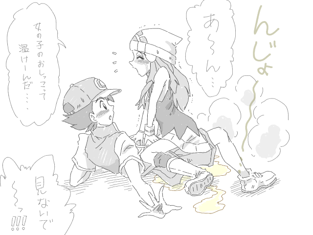 | シンオウ編 たまたまサトシと別行動をしていたヒカリは尿意を催していた。 ヒカリ「おトイレ行っとけばよかった……もうだいじょばないかも……ここならだれもいないよね……」 ヒカリが崖の上からおしっこしようとしていたが、足を踏み外してしまった。 ヒカリ「きゃああああ!!」 ヒカリが落ちたさきはたまたまヒカリと別行動をしていたサトシの上。 ショロロロ〜〜〜 サトシ「いてて……だいじょうか?ヒカリ……」 ヒカリ「だいじょばない……あーん!見ないで〜!」大泣き サトシ「女の子のおしっこって温けーんだ。」 ![]() カロス編 セレナ(ショートの姿)は尿意を催していたが、次の町が近いので我慢していたが。 セレナ「うう……やっぱりもうダメ……その辺の木陰でも……」 セレナは木陰まで駆け込もうとするも、躓いてしまい、サトシの上に倒れこんだ。 ショロロロ〜〜〜 サトシ「どうしたんだセレナ……」 セレナ「あーん!!見ないで〜!!」 サトシ「女の子のおしっこってやっぱり温かけーんだな。」 セレナ「よりにもよってサトシに見られてちゃった〜〜〜!!」大泣き アローラ編 キャンプ中リーリエは尿意を催していた。 リーリエ「この辺にお手洗いなんて……論理的結論として、木陰か崖上でするしかありませんね。」 リーリエは木陰で用を足そうとすると、以前リーリエを襲ったことのあるヤトウモリが飛び出してきた。 いくらポケモンに触れるようになったとはいえ、無防備な所を襲われては……と即座にパンツをはきなおして逃げようとするリーリエだったが、ヤトウモリはこの前の仕返しと言わんばかりに足払いをかけてリーリエを転ばせる。 リーリエが転んだ先にはサトシがいた。 そして、ヒカリ、セレナと同じようにサトシの上で…… ショロロロ〜〜〜 リーリエ「うう……わーん!!見ないでくださーい!」 サトシ「リーリエのも温かけーな。」 リーリエ「よりにもよってサトシの上でおもらしなんて、しかも、目と鼻の先で……」大泣き |
