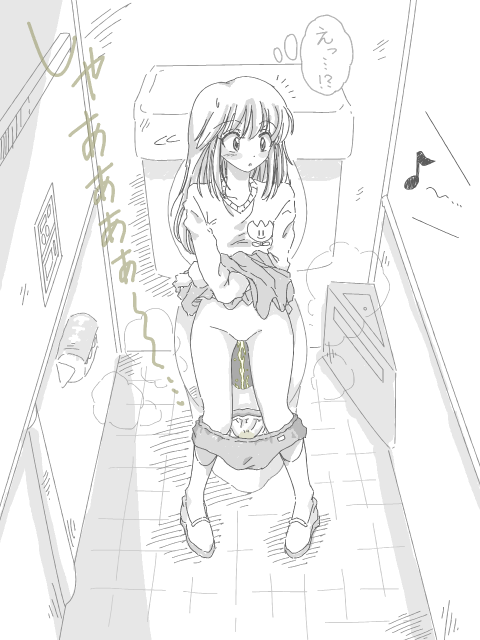 | 「おしっこしたい・・・」 授業中、トイレに行きたいのを我慢する一人の生徒、かほる。 先ほどの休憩時間にそこに行きそびれてしまったのだ。 「授業が終わったら、すぐにトイレに・・・」 そう思いながら、教室にある時計に目をやると、あと5分ほどで休憩時間に入る。 「もうちょっとの辛抱・・・」 自身を励ますかほる。 そして5分後、 「キンコンカンコン キンコンカンコン」 授業終了の鐘が鳴った。 急いでトイレに向かおうとするかほるであったが、近くにいた友人が声をかけてきた。 「ねえ、かほるちゃん。先生に質問したいことがあるんだけど、いっしょについてきてもらってもいい?」 「う、うん。いいよ・・・」 おしっこが漏れそうなのに、「トイレに行きたいから、無理!」とは言えなかったかほる。 そのまま、友人に連れられ、先生の前へと進んでいった。 「先生、質問があるのですが、いいですか?」 「これとここの問題が○○で・・・」 「あれが△△になって・・・」 かほるの危機的状態に全く気がつかず、質問を続ける友人。 「そんな質問、あとでもいいじゃない!」 「そんなことより、早くトイレに!」 先生と友人の横で、いら立ちを隠せないかほる。 「ああっ、早くしないと休憩時間が終わっちゃうよう・・・」 「早くして!」 だんだんとあせるかほるをよそに、先生と友人の会話はまだ終わりそうにない。 それから数分後、やっと友人の質問が終わった。 「これでトイレに行ける!」 急いで教室を出ようとするかほるに、またもや友人が声をかけてきた。 「ねえ、かほるちゃん。××が何々で・・・」 何かを話しかけられている状況は理解できたが、内容はほとんど頭にはいってこないかほる。 「もう、いい加減にしてよ!」 「おしっこ、漏れるよう・・・」 「ごめん、ちょっとトイレに行ってきていい?」 さすがにこのままだとまずいと思ったかほるは、そういうとトイレに向かって歩き出した。 トイレに着くと、後ろを歩いていた友人も、トイレへと入ってきた。 「私もトイレしよー」 のんびりと個室に入る友人をよそに、慌てて個室のカギをかけ、ブルマとパンツを下ろすかほる。 友人が隣の個室にいるため、音消しボタンを押してから、おしっこをしようと思っていたかほる。 しかし、そんなコンマ何秒の時間さえ、今のかほるには待ちきれなかった。 スカートをたくし上げ、和式便器に腰を落としている最中にもかかわらず、おしっこが尿道より噴き出してくる。 「プシューーー」 勢いよく飛び出したおしっこは、便器にあたり、一部の飛沫は床へと飛び散っている。 「はあぁ・・・」 かほるが安ど感に浸っているころ、隣の個室から、音消し音が聞こえてきた。 友人もおしっこを始めたようだ。 隣から流れる音消し音で、かほるは我に返り、慌てて彼女もそのボタンを押したが、時すでに遅し。 かほるの激しい尿音は、ばっちりと友人に聞かれてしまったことだろう。 ![]() 恥ずかしさがこみあげてくるかほる。 しかし、友人はその後何もそれについて触れてくることはなかったので、それがかほるにはありがたかった。 |