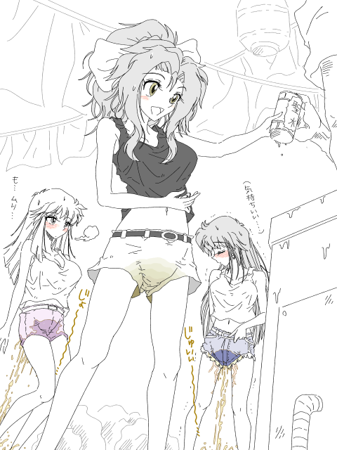 | 8月10日 都内キャストラ本社隣接のキャストラパーク キャストラ夏祭りと打ち出されたTV局を上げての夏祭り。例年多くの人であふれる。 キャストラの人気キャスターたちの「出店」が出され、人気キャスター・タレントから直接購入できるため多くの人がここお平場(おひらば)に訪れていた。 「暑い〜」遠山恭華は額の汗をぬぐって振り向いた。 「涼子さん、すごい人ですね。でも刑事課の私たちまで繰り出されるなんて、ひどい話じゃないですか!」 「まぁまぁ、キャストラTVさんには普段世話になっているし、それに…まぁその…警備担当のルックスを考えて、警視庁が私たち二 人を送り出したらしいぞ…」 と少し照れ気味に村下涼子が答えた。 「それにしてもすごい人ですね〜。トイレ行く暇もないです〜」 「そうだな、これだけ暑いと水分も多く取るしな、そこはうまく交代で行こう」 そうして会場を見渡す二人だった。 毎年、行われるキャストラ夏祭り今年も大賑わいだ。 主な人気店は、真行寺クロエ・加納綾子のアダルト二人のふわふわすぎるソフトクリームの店、化学監修としてキャストラを支える加藤ミゾレ・遠山麗香の体感温度が5度下がるランジェリーショップ、新人枠和久いずみ・環希加奈の冷た〜いアイスパフェなどが人気の店舗だったが、中でもホットパンツにタンクトップという夏真っ盛りの恰好をした美女3人の店がとりわけ人気だった。 ごくっ、ごくっ、ごくっ! さやかは販売しているノンアルコールビールをがぶ飲みしていた。 「あ〜っ!おいしい!」 そのおいしそうに飲む姿に、彼女たち3人が販売するノンアルコールビールは炎天下の聖水のように見え、彼女たちの飲み姿につら れるように飛ぶように売れていた。 なびき・さやか・詩織の3人は真ノンアルビール「聖水」を販売していたのだ… おもらしを全国ネットにさらした3人が売るビールが「聖水」とはきっとネーミングは変態の石田あたりだろう・・・ ごくっ、ごくっ、ごくっ… ごくっ、ごくっ、ごくっ… なびき・詩織も飲んでいるが、なにやら二人は落ち着きがなくなって来ていた。 「なびき、トイレ行きたい…」 「私も…さやか元気そうだけど…うんっ?」 詩織はさやかの股間の異変に気が付いた。 詩織の視線に気が付いたさやかはペロッと舌をだして、途切れないお客様の対応をしながら詩織に近づいた。 「少しずつ漏らすのよ。この炎天下なら、多少漏らしてもすぐ乾く。大丈夫!」 詩織は驚いたが、確かにさやかのいで立ちは黒のタンクトップに白のホットパンツ。 ビールで薄まった尿はさほどシミならない。 しかし、詩織は淡いブルーのデニムのホットパンツに白のタンクトップ、なびきはピンクのホットパンツにグレーのタンクトップだったので、少しずつ漏らすことはできなかった。 『うっ〜、少しずつ漏らしていてもすぐ尿意がきちゃう…』 じゅわっ… 「ありがとうございます!」さやかの笑顔が時折引きつるが、その瞬間は尿が漏れていた。 じゅわっ…さやかの股間にじわっと尿が広がり、夏の太陽に照らさてあふれ出る尿が一瞬、キラキラとした。 「えっ!」 ビールを買ったお客さんも気が付いたようだ。 中年男性のアンテナがぴくんと動いていた。 「ありがとうございます〜、次の方どうぞ〜」 さやかは慌てて商品を私、次の方を促した。 『今のはちょっと出すぎた…太ももにもちょっと流れたな…危ない、危ない』 そう思って、さりげなく太ももの尿を手で拭うさやかだった。 「詩織、あと何分で休憩だっけ?」 「なびき、まだ1時間もあるよ…」 「もう無理かも…」 ちびるさやかを横目にホットパンツの色で漏らせない二人は脂汗がにじんでいた。 30分ほどったあと… 「ありがとうございます!」さやかは笑顔で6瓶セットのビールを元気よく渡すとその客は怪訝そうにさやかの股間を見ていた。 『何よ、この人変態?そんなに太ももが見たいの!気持ちわるっ!』 そう思ってさやかは販売をつづけた。 詩織・なびきの動きが尿意で緩慢になる中で、さやかだけは元気だった。 しかし… やたら人の視線が気になる… みんなさやかの股間を見ては嘲笑していた。 『なに?なに?』 さやかは視線が気になり、ゆっくり股間に目を向けた… 「ぎゃっ!」 赤面し、内股で股間を隠すさやか。 そう、何時間にもわたってちびり続けたオシッコが夏の太陽で乾かされ、何重にも薄黄色い輪を広げおもらしジミへと変わっていた。 そう、白の生地はなかなか濡れが目立たない…しかし乾くとその黄ばみがはっきりと浮き出てくるのだった。 さやかは真っ赤になり腰を引きながら残りの時間の対応をすることになった。 もちろん、詩織・なびきも最後まで持たず恥ずかしいおもらしを晒すこととなった。 あと噂では、警視庁の遠山恭華も女子トイレ前で失禁していた姿がSNSに公開されていた。 ![]() |
