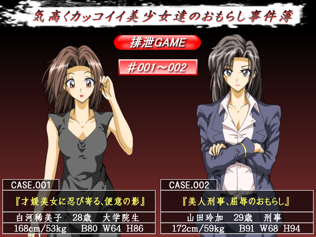 | ■CASE.001『才媛美女に忍び寄る、便意の影』 CASE.002『美人刑事、屈辱のおもらし』 CASE.003『憧れの美人チーフ、小便で汚れた臭い足』 CASE.004『美人キャリアのおもらし事件』 CASE.005『美人、屁をこきゃ糞もする』 CASE.006『女課長の恥ずかしいおねしょ』 ■シーンCG8枚、本文12頁。 画:tyao 作:gg |